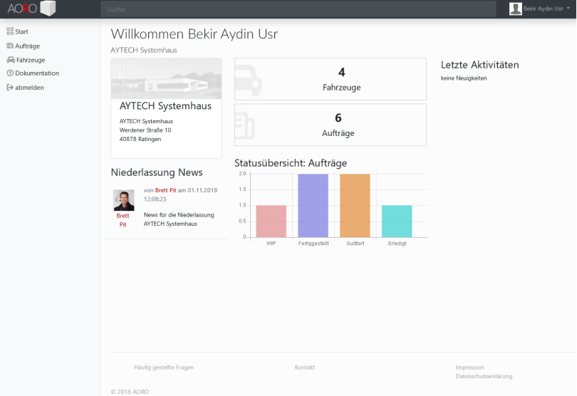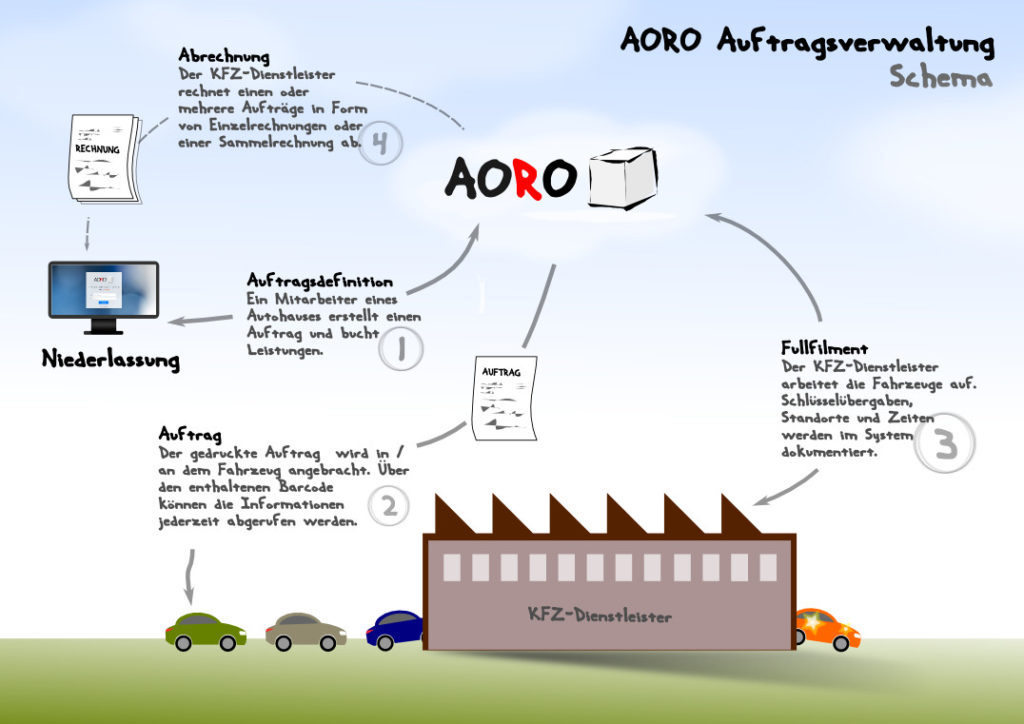 AORO dient zur Erfassung, Organisation, Dokumentation und Abrechnung von Auftragsleistungen eines externen Dienstleisters für fahrzeugbezogene Arbeiten im Auftrag eines Autohauses bzw. einer Niederlassung. Die Plattorm wird für den externen Dienstleister erstellt und von diesem mit seinem Kunden gemeinsam genutzt. Es können für den einzelnen Kunden bzw. deren Niederlassungen Zugänge zum System eingerichtet werden.